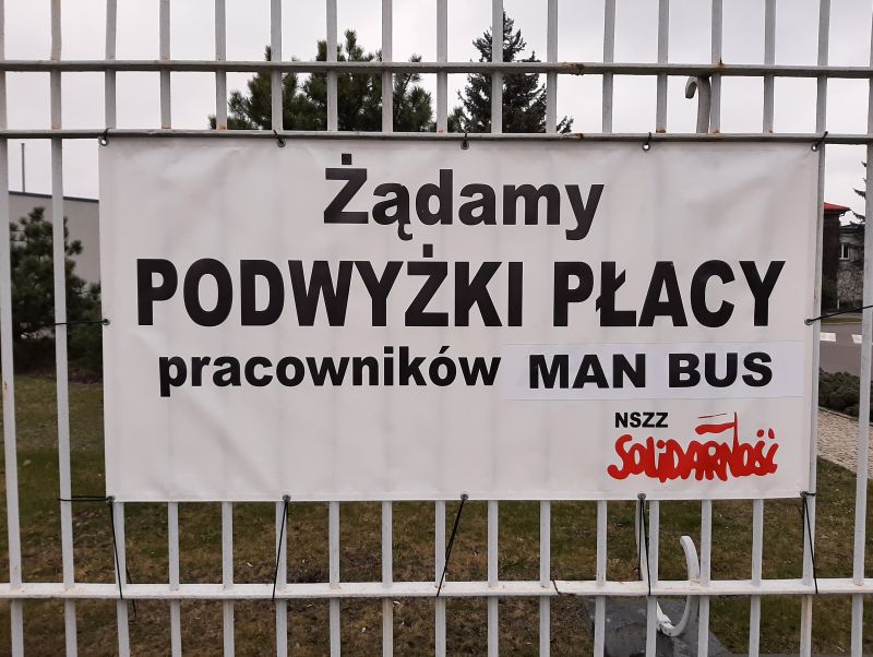 W związku z brakiem reakcji Zarządu firmy na nasze postulaty dotyczące podwyżki płacy pracowników MAN BUS kontynuujemy naszą akcję protestacyjną. W dniu dzisiejszym (9 kwietnia) wychodząc z pracy zatrzymujemy się na parkingu przy swoich samochodach i włączamy klaksony. I tak przez 15 minut. Z parkingu wyjeżdżamy bardzo powoli i tak samo wolno przejeżdżamy aż do Budynku Biurowca Głównego MAN. Podczas przejazdu używamy klaksonów. Gdy i ta forma protestu nie skłoni Zarządu do rozmów podjęte zostaną kolejne bardziej radykalne działania. Podczas akcji protestacyjnej należy przestrzegać przepisów epidemicznych. Nasze postulaty to: 1. Podwyżki płacy zasadniczej o 200 zł., 2. Podwyżki płacy zasadniczej o średnioroczny stopień inflacji za rok 2020. 3. Włączenia do płacy zasadniczej premii regulaminowej.