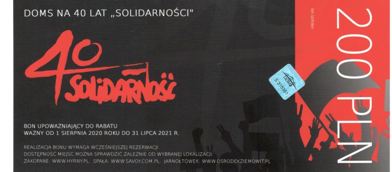 Z okazji 40 rocznicy powstania NSZZ „Solidarność” wszyscy członkowie Związku otrzymają okolicznościowe kubki i bony upoważniające do rabatu (200 zł) do wykorzystania w ośrodkach wypoczynkowych „Hyrny” i „Sienkiewiczówka” w Zakopanem, „Savoy” w Spale, „Ziemowit” w Jarnołówku. Bon jest ważny do 31 lipca 2021 roku. Członkowie „Solidarności” posiadający legitymacje związkowe otrzymają w tych ośrodkach dodatkową 10% zniżkę. Kubki i bony rozprowadzamy już od kilku tygodni, ale jeszcze nie do wszystkich członów Związku udało nam się dotrzeć. Osoby, które jeszcze kubków i talonów nie otrzymały proszone są o kontakt z naszym biurem.