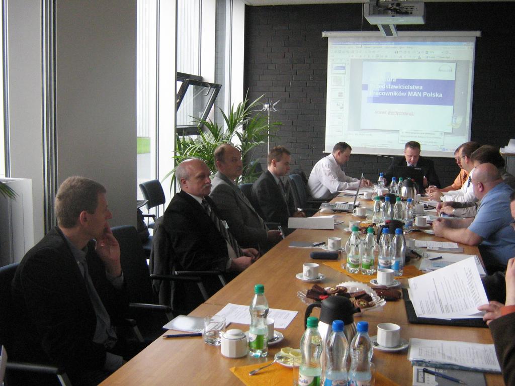 W dniach 19 i 20 maja w zakładzie MAN Trucks w Niepołomicach odbyło pierwsze spotkanie przedstawicieli Rad Pracowników wszystkich zlokalizowanych w Polsce zakładów MAN-a. Reprezentowane były zakłady: MAN Bus Starachowice, MAN Bus Poznań, MAN Trucks Niepołomice, MAN Accounting Center (MAC) z Poznania. Poszczególne zakłady reprezentowali: Rafał Borkowski - członek Rady Zakładowej MAN SE (NSZZ "Solidarność"), Marek Berdychowski - członek Rady Zakładowej MAN SE (przewodniczący Rady Pracowników MAN Poznań Sady), Andrzej Kępiński przewodniczący Rady Pracowników MAN Starachowice (NSZZ "Solidarność"), Jan Seweryn członek Rady Pracowników MAN Starachowic (przewodniczący NSZZ "Solidarność" w MAN Starachowice), Andrzej Grajkowski członek Rady Pracowników MAN Niepołomice (przewodniczący NSZZ "Solidarność" w MAN Niepołomice), Bogusław Mazur członek Rady Pracowników MAN Niepołomice (NSZZ "Solidarność"), Piotr Głodzik sekretarz Rady Pracowników MAN Poznań Sady (przewodniczący ZZ), Rafał Szmyt członek Rady Pracowników MAN Poznań Sady (ZZ), Maciej Fechner członek Rady Pracowników MAN Poznań Sady (ZZ), Wojciech Petrus sekretarz Rady Pracowników MAN Starachowice (przewodniczący ZZ Metalowcy), Jan Truchlewski członek Rady Pracowników MAN Starachowice (ZZ Metalowcy), Jarosław Kozera członek Rady Pracowników MAC Poznań. W spotkaniu udział wzięli także Thomas Otto związek zawodowy IG Metall (wiceprzewodniczący Rady Nadzorczej MAN SE) i Willi Dienstbier (członek Rady Zakładowej MAN Monachium). Gośćmi spotkania byli: prezes zakładów autobusowych MAN-a Michale Kobriger i Martin Oetien prezes MAN Trucks Niepołomice a także Kinga Włoskowicz dział personalny MAN Bus i Bogdan Lis dział personalny MAN Niepołomice.Podczas dwudniowych obrad omówiono sytuację w polskich i niemieckich zakładach MAN-a a także zapoznano się ze strukturą organizacyjną koncernu i strukturą rad pracowników koncernu. Dyskutowano o celowości wzajemnej wymiany informacji a także o wprowadzeniu jednolitego pakietu socjalnego, który obejmowałby wszystkich pracowników MAN-a. W dalszej części spotkaniu Thomas Otto przeprowadził dyskusję na temat Międzynarodowych Porozumień Ramowych, które obecnie są tworzone w MAN SE. Kolejnym punktem spotkania była dyskusja z przedstawicielami pracodawcy, której głównym wątkiem były dysproporcje płacowe pomiędzy poszczególnymi zakładami MAN-a. Według przedstawicieli pracowników nie do przyjęcia jest obecna polityka płacowa, która opiera się na płacach regionalnych a nie na wynikach ekonomicznych zakładów. Prezesi Kobriger i Oetjen przedstawili ogólne plany rozwoju firm, którymi kierują. Na zakończenie spotkania ustalono, że jesienią odbędzie się kolejne spotkanie, którego jednym z tematów będzie wymiana doświadczeń związkowych.