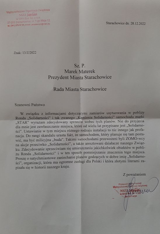 Sz. P. Marek Materek Prezydent Miasta Starachowice - Rada Miasta Starachowice - Szanowni Państwo. W związku z informacjami dotyczącymi zamiarów usytuowania w pobliży Ronda „Solidarności” i tak zwanego „Kamienia Solidarności” samochodu marki „STAR” wyrażam zdecydowany sprzeciw wobec tych planów. Nie do przyjęcia dla mnie jest zawłaszczanie miejsca, które od wielu lat przypisane jest „Solidarności”. Ustawianie w tym miejscu różnego rodzaju instalacji to nic innego jak profanacja. Do rangi skandalu urasta fakt, że samochodem, który planuje się tam postawić, ma być milicyjna „buda”. Takimi samochodami przewożeni byli ZOMO-wcy na akcje przeciwko „Solidarności”, a także aresztowani działacze naszego Związku. Zdecydowanie sprzeciwiam się umieszczaniu jakichkolwiek obiektów w pobliżu Ronda „Solidarności” i w ten sposób pomniejszanie znaczenia tego miejsca. Proszę o natychmiastowe zaniechanie planów godzących w dobre imię „Solidarności”, organizacji, która ma ogromne zasługi dla Polski i która złotymi literami zapisała się w historii naszego kraju. Z poważaniem Jan Seweryn Przewodniczący Komisji Międzyzakładowej NSZZ „Solidarność” w MAN Bus