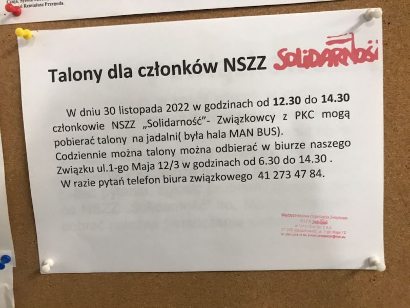 W dniu wczorajszym odbyło się spotkanie związków zawodowych z Zarządem MAN. Tematem było zwolnienie 860 pracowników. Zarząd przedstawił propozycje dotyczące warunków tych zwolnień. Pracownicy, którzy zgodziliby się na pracę na Słowacji otrzymaliby 50 tysięcy złotych i pokrycie kosztów zakwaterowania. Mowa była o odprawach dla osób, które by odeszły na zasadzie porozumienia stron. Nie bardzo wiadomo, co to oznacza, bo nie przewiduje się uruchomienia programu dobrowolnych odejść. Ewentualne odprawy dotyczyć by miały tylko pracowników zatrudnionych na umowach stałych. Nie ma zgody na jakieś gratyfikacje pieniężne dla tych, którzy zdecydowaliby się na pracę w Niepołomicach i w PKC. Niespodziewanie pojawiła się informacja, że PKC oferuje nie, 300 ale 500 miejsc pracy. Czy te miejsca już są czy dopiero mają być stworzone nie wiadomo. Nie jest wiadomo na jakich warunkach PKC ma zamiar zatrudniać pracowników zwalnianych z MAN-a. Pytań jest znacznie więcej. Najgorsze w tym wszystkim jest to, że w dalszym ciągu nie są uwzględniane wnioski związków zawodowych. „Solidarność” podtrzymuje swoje postulaty z których najważniejsze są: program dobrowolnych odejść i odprawy dla wszystkich zwalnianych. Równie ważny jest postulat, aby pracownicy, którzy mają być zwolnieni, zostali o tym przykrym fakcie poinformowani. Następne spotkanie zaplanowano na poniedziałek 5 grudnia. Jak widać pracodawca, który do tej pory unikał dyskusji na temat zwolnień, narzuca ekspresowe tempo.